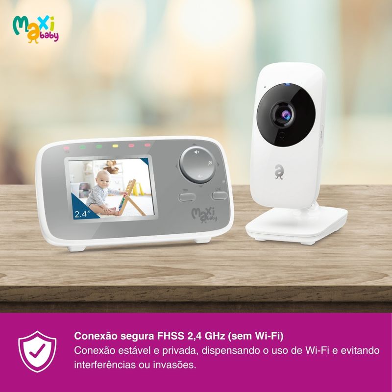 Com conexão segura e privada via tecnologia FHSS de 2,4 GHz, a Baby ON da Maxi Baby dispensa Wi-Fi e elimina qualquer risco de invasão, proporcionando uma comunicação estável e protegida entre as unidades.
