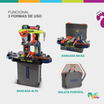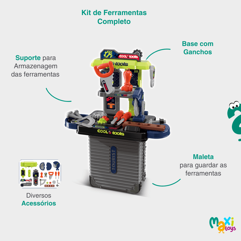 O brinquedo possui um design funcional 3 em 1: pode ser usado como bancada de trabalho alta, bancada baixa e maleta portátil de ferramentas, tornando a brincadeira ainda mais prática e organizada. Acompanha diversos acessórios de ferramentas como chave de fenda, martelo, serrote, parafusos e outros itens que imitam ferramentas reais, tudo em tamanho ideal e feito com materiais seguros.