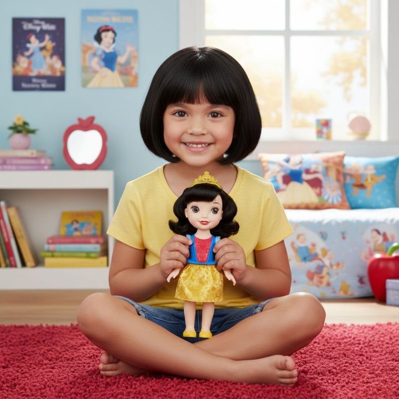 Inspirada na personagem que deu início à história das Princesas Disney, ela traz toda a doçura, delicadeza e encanto que marcaram gerações. Possui o vestido clássico em azul, vermelho e amarelo, coroa dourada e cabelos pretos ondulados, recriando fielmente o visual da Branca de Neve. É perfeita para recriar as cenas da floresta, os momentos com os anões ou inventar novas histórias cheias de magia.