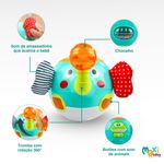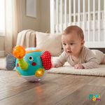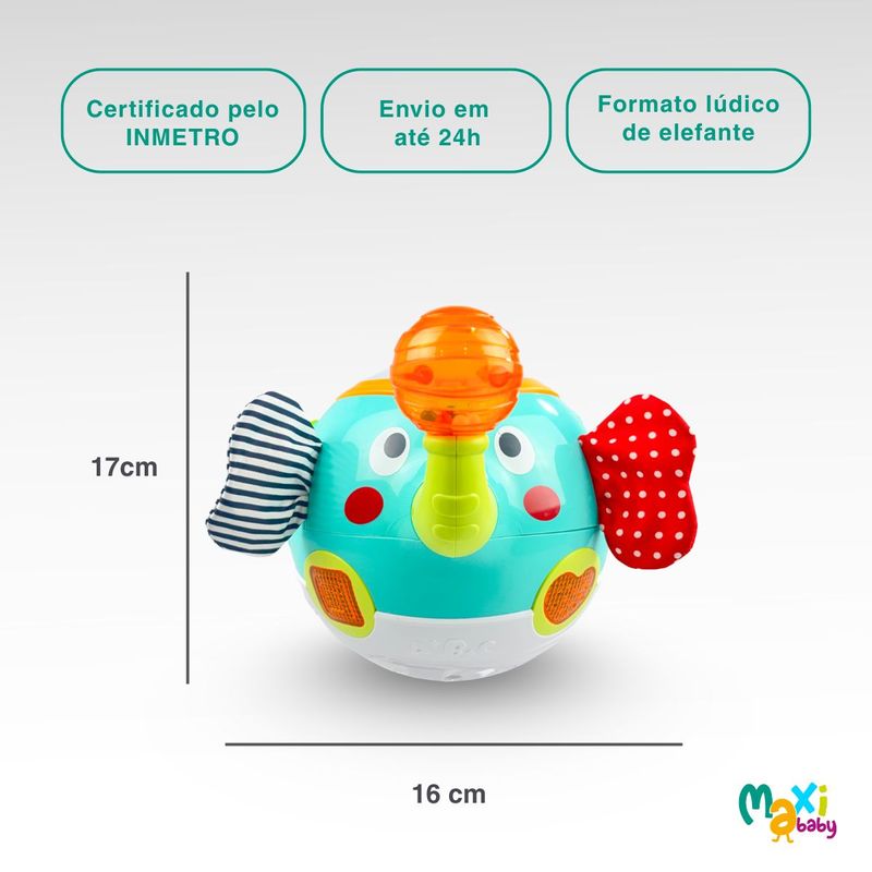Equipada com luzes coloridas que piscam no ritmo das músicas. Possui botões interativos que tocam diferentes estilos musicais, desde batidas de tambor, sons de animais até canções relaxantes. Além disso, a tromba do elefante gira em 360° emitindo um som de "clique" super satisfatório, enquanto a esfera transparente no topo funciona como um chocalho vibrante, aguçando a percepção auditiva e tátil do seu filho.
