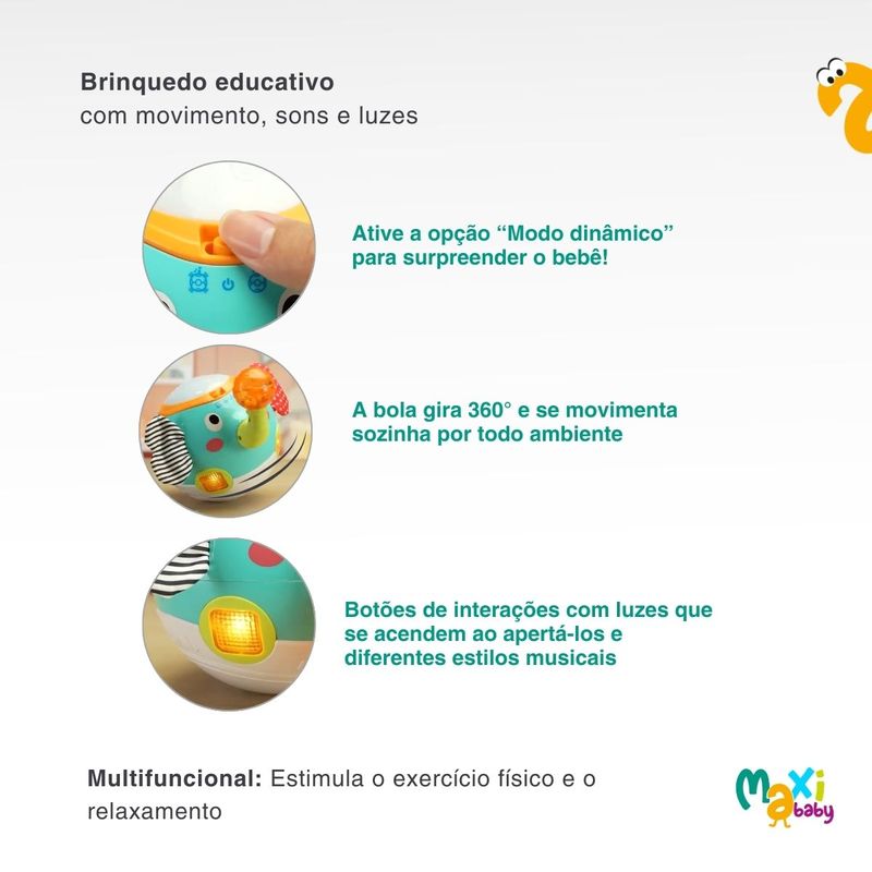 O grande destaque deste brinquedo é a sua capacidade de tirar a criança da inércia e estimular o desenvolvimento físico de forma natural. No Modo Dinâmico, a bola gira 360° e se desloca sozinha por todo o ambiente, desafiando a curiosidade do pequeno e servindo como o incentivo perfeito para ele começar a engatinhar e se exercitar. É a ferramenta ideal para fortalecer a coordenação motora enquanto a criança se diverte tentando alcançar seu novo amigo.