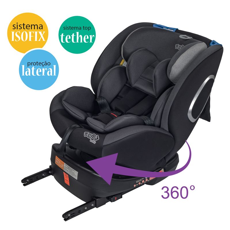 Conforto: Sistema rotacional 360! Permite que o assento gira 360° graus mesmo já instalado, podendo ser virado em diversas posições, para que os pais tenham mais praticidade na hora de tirar e colocar a criança no assento. Possui 4 posições de recline, ajuste do encosto de cabeça, estofado confortável com o dobro de espuma e tecido de qualidade removível para limpeza.