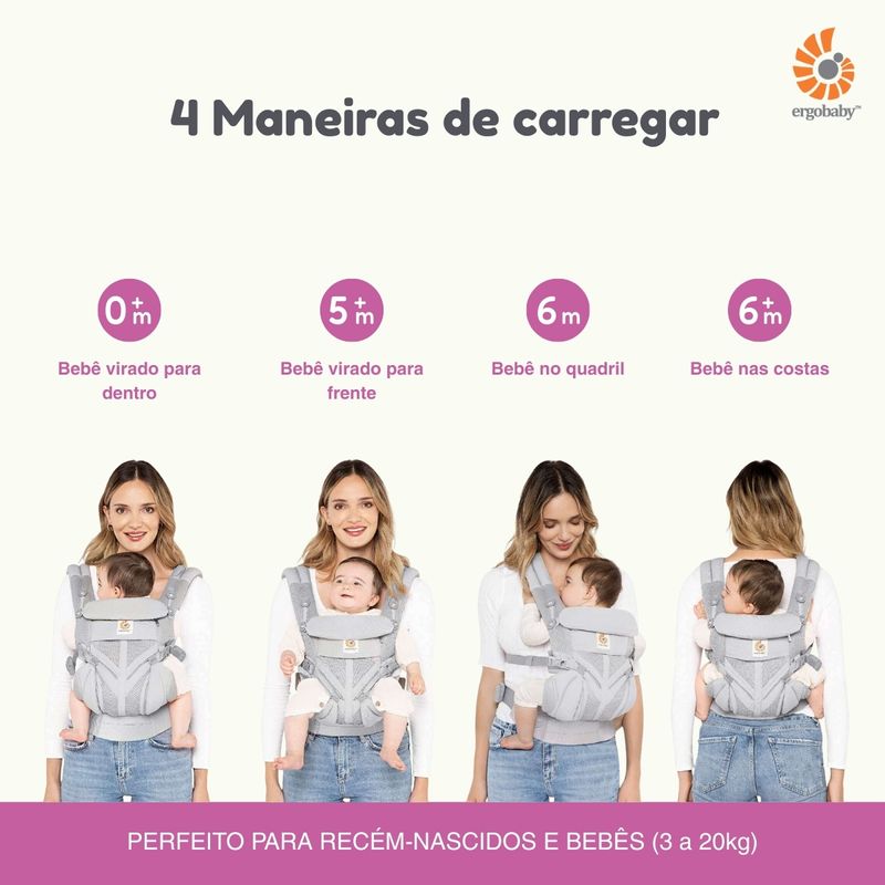 - Possui 4 posições de transporte: Voltado para dentro (0m+), Voltado para fora (5m+), Transporte no Quadril (6m+) e Transporte nas Costas (6m+)