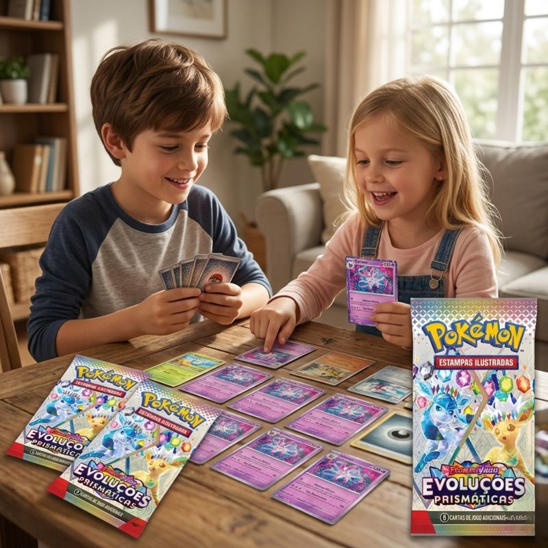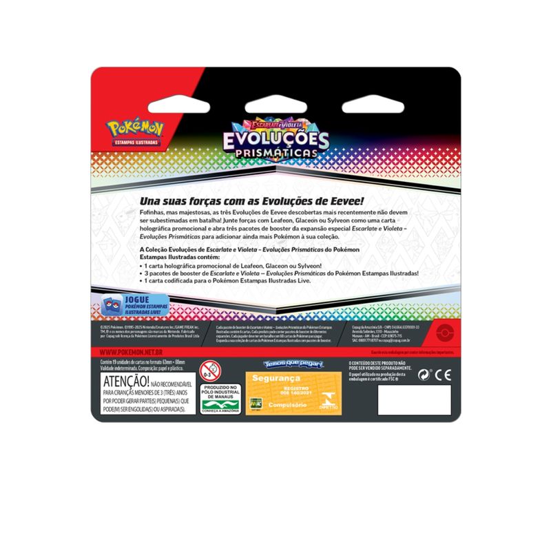 Este conjunto inclui três pacotes de booster da expansão especial Escarlate e Violeta — Evoluções Prismáticas, cheios de cartas incríveis que podem expandir suas estratégias e coleção. Quais cartas você irá encontrar? A diversão está em descobrir!