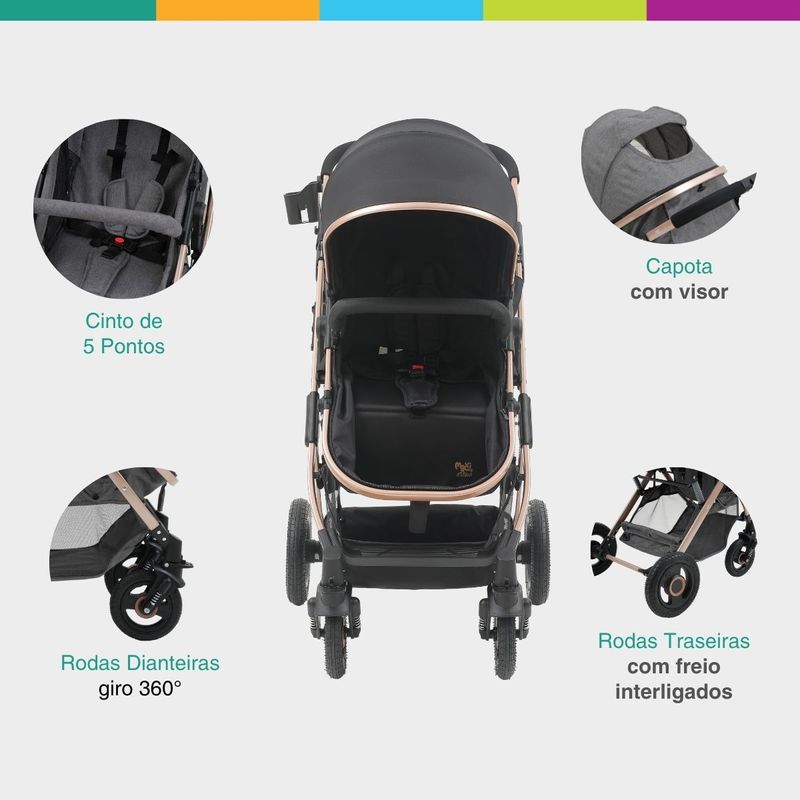 Com uma estrutura reforçada em ferro e alumínio, suspensão completa, freios interligados nas rodas traseiras e 2 rodas dianteira com giro 360° garante estabilidade e suavidade em qualquer tipo de terreno, acompanhando o ritmo da família em todos os momentos. Sistema de fechamento com apenas uma mão facilita o uso no dia a dia.