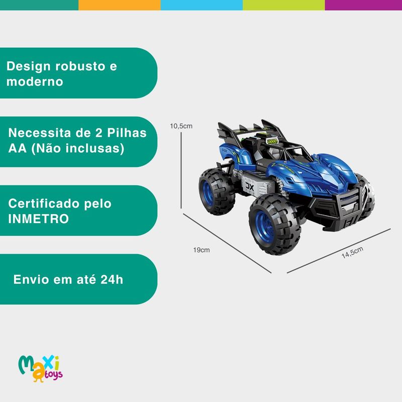 O controle remoto, que opera em 49 MHz, permite total liberdade de movimentos com comandos para frente, ré, curvas à esquerda e à direita, exigindo apenas 2 pilhas AA (não inclusas). Essa combinação garante resposta ágil e uma experiência realista de condução, tornando cada manobra ainda mais emocionante.