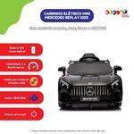 Mini veículo Mercedes GT é um modelo completo e com grande estilo. Possui painel todo equipado trazendo um realismo que vai além de um brinquedo, com luzes, sons, entrada para MP3, cartão de memória e USB. Além de um motor capaz de suportar até 30kgs, sendo acomodado por apenas um condutor.
