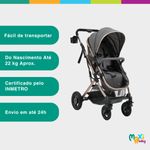 Com uma estrutura reforçada em ferro e alumínio, suspensão completa, freios interligados nas rodas traseiras e 2 rodas dianteira com giro 360° garante estabilidade e suavidade em qualquer tipo de terreno, acompanhando o ritmo da família em todos os momentos. Sistema de fechamento com apenas uma mão facilita o uso no dia a dia.