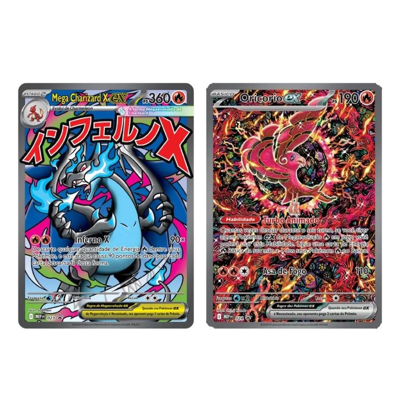 Este Pokémon ex de Megaevolução feroz consome Energia de Fogo para abastecer seu ataque Inferno X, usando mais dano para cada carta que você descartar. Nesta coleção, encontre Mega Charizard X ex como uma carta laminada promocional, junto de outra carta laminada promocional de Oricorio ex, que ajudará a colocar mais Energia de Fogo em jogo. Além disso, mais Pokémon esperam você em uma pilha de pacotes de booster!