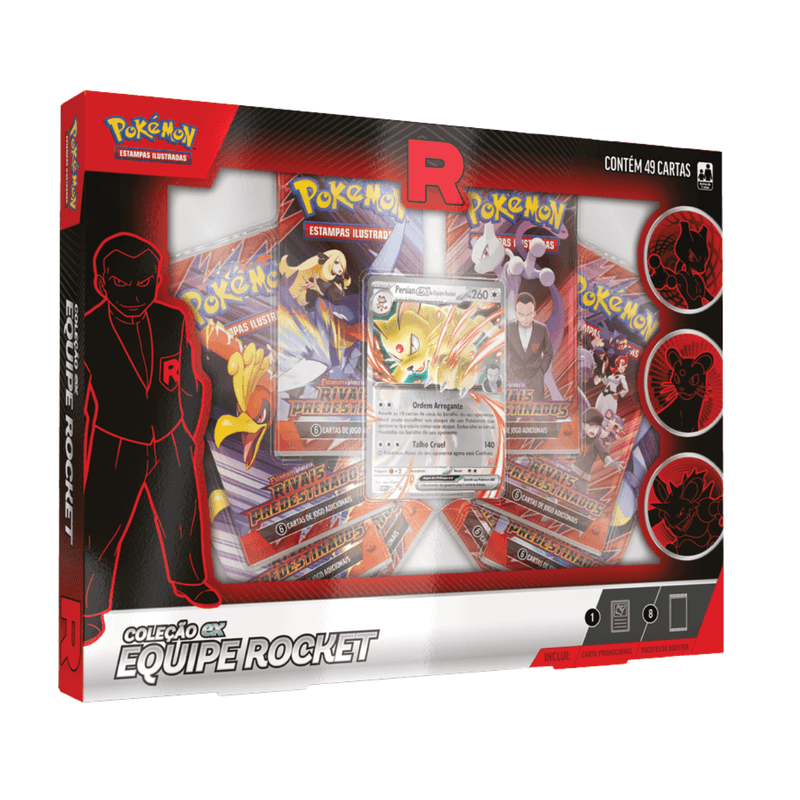 Prepare-se para o lado sombrio do universo Pokémon com a Box Equipe Rocket Mewtwo, Persian e Nidoking EX da Copag! Esta edição especial traz o lendário Mewtwo, Persian ou Nidoking EX em destaque, ao lado de uma seleção poderosa de cartas inspiradas na icônica Equipe Rocket, vilões clássicos do mundo Pokémon.