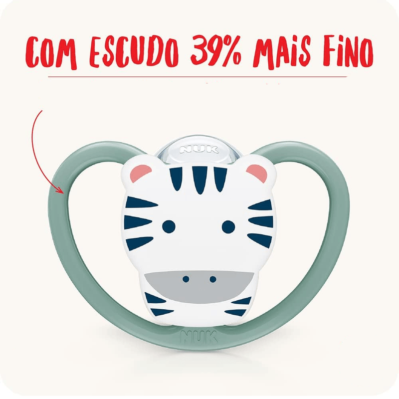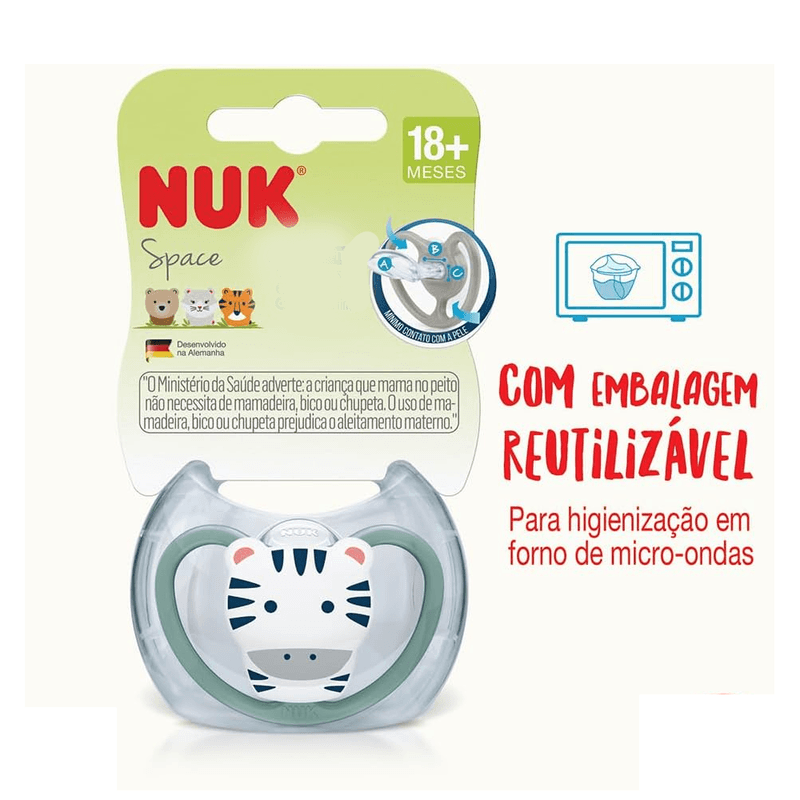 A NUK Space possui bico tamanho 3 (+18 Meses). A chupeta é livre de BPA.