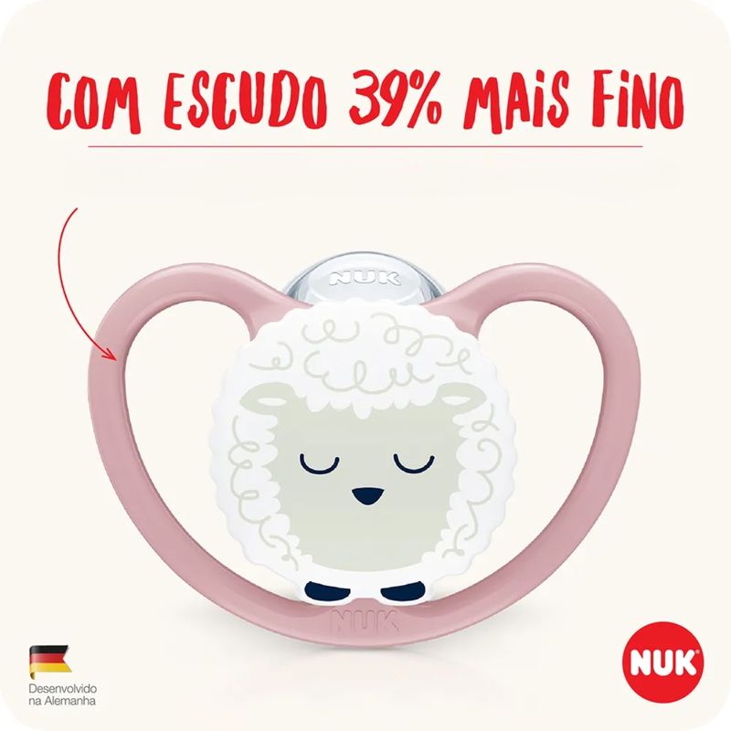 A Chupeta NUK Space Glow brilha no escuro e pode ser encontrada rapidamente, sem precisar acender a luz durante a noite Sua tecnologia "brilha no escuro" não é tóxica e não faz mal a saúde da criança A NUK Space foi desenvolvida com canais extragrandes de ventilação para permitir a máxima circulação de ar, possibilitando que a pele sensível respire.