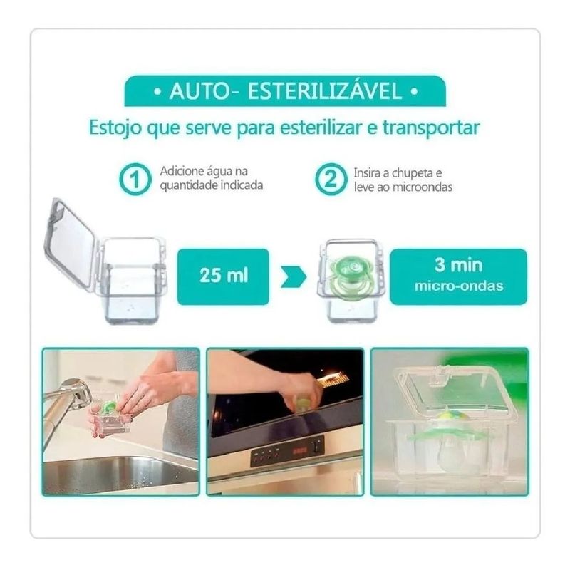 - Conteúdo da Embalagem: 1 Chupeta e 1 Estojo para esterilização e transporte
