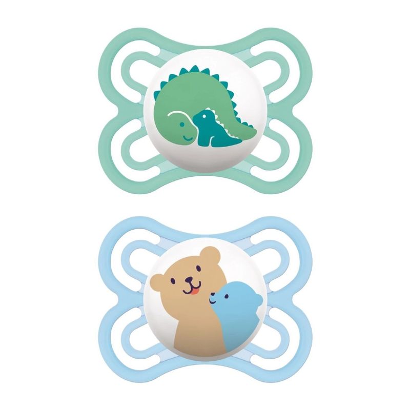 Kit com 2 Chupetas Bico de Silicone Perfect MAM com estampas variadas. Embalagem Dupla.