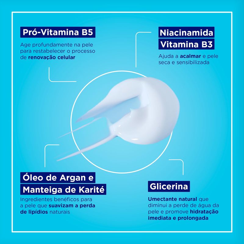 Sua fórmula única com Dexpantenol Repair Complex atua diretamente nas causas da pele seca, oferecendo a revitalização da pele ao reforçar a barreira protetora natural. É recomendado para o uso diário em pele sensível e seca, oferecendo uma hidratação imediata que dura por até 48 horas.