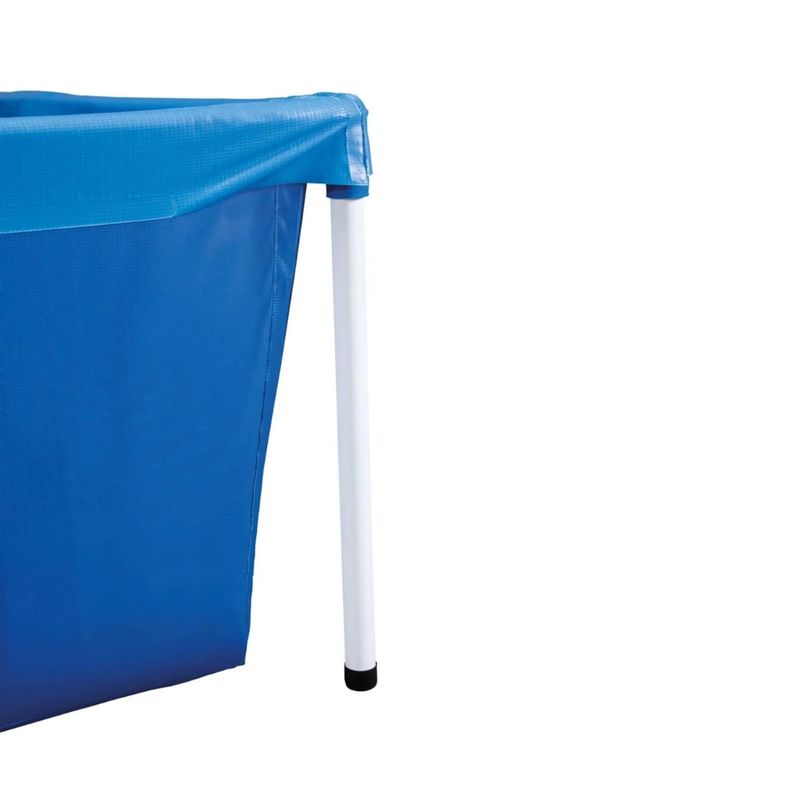 Em aço carbono, a estrutura da Piscina possui pintura em epóxi e cada bastão possui acabamento emborrachado no pé, além de contar com escoras de seguranças que evitam que a piscina deslize no solo. Possui válvula de deságue para facilitar a limpeza e possui tripla camada (duas lâminas de PVC com uma trama de poliéster entre elas) que garante a resistência do produto.