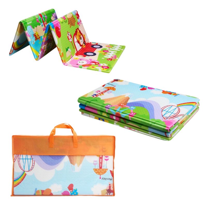 Ideal para uso interno e externo, o tapete acompanha bolsa de transporte, garantindo praticidade para levar para passeios, viagens ou qualquer lugar onde o bebê precise de um espaço seguro para brincar.